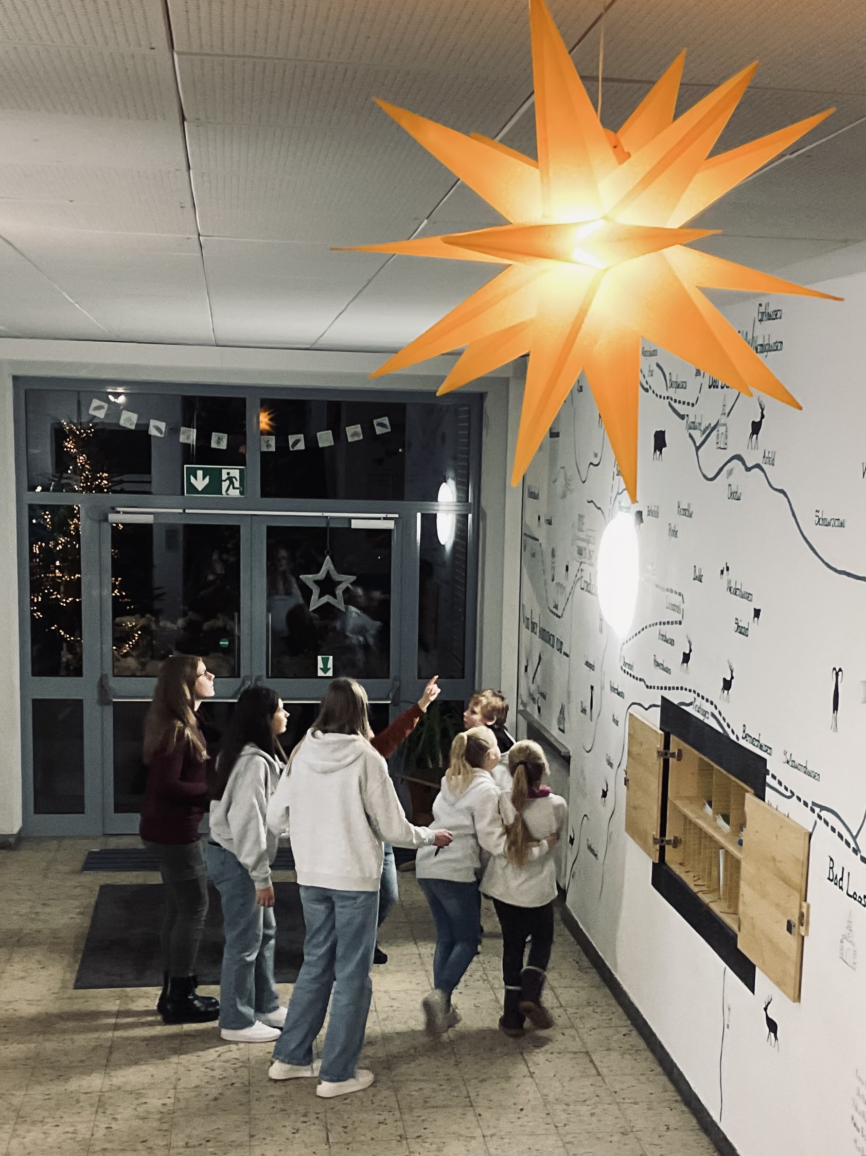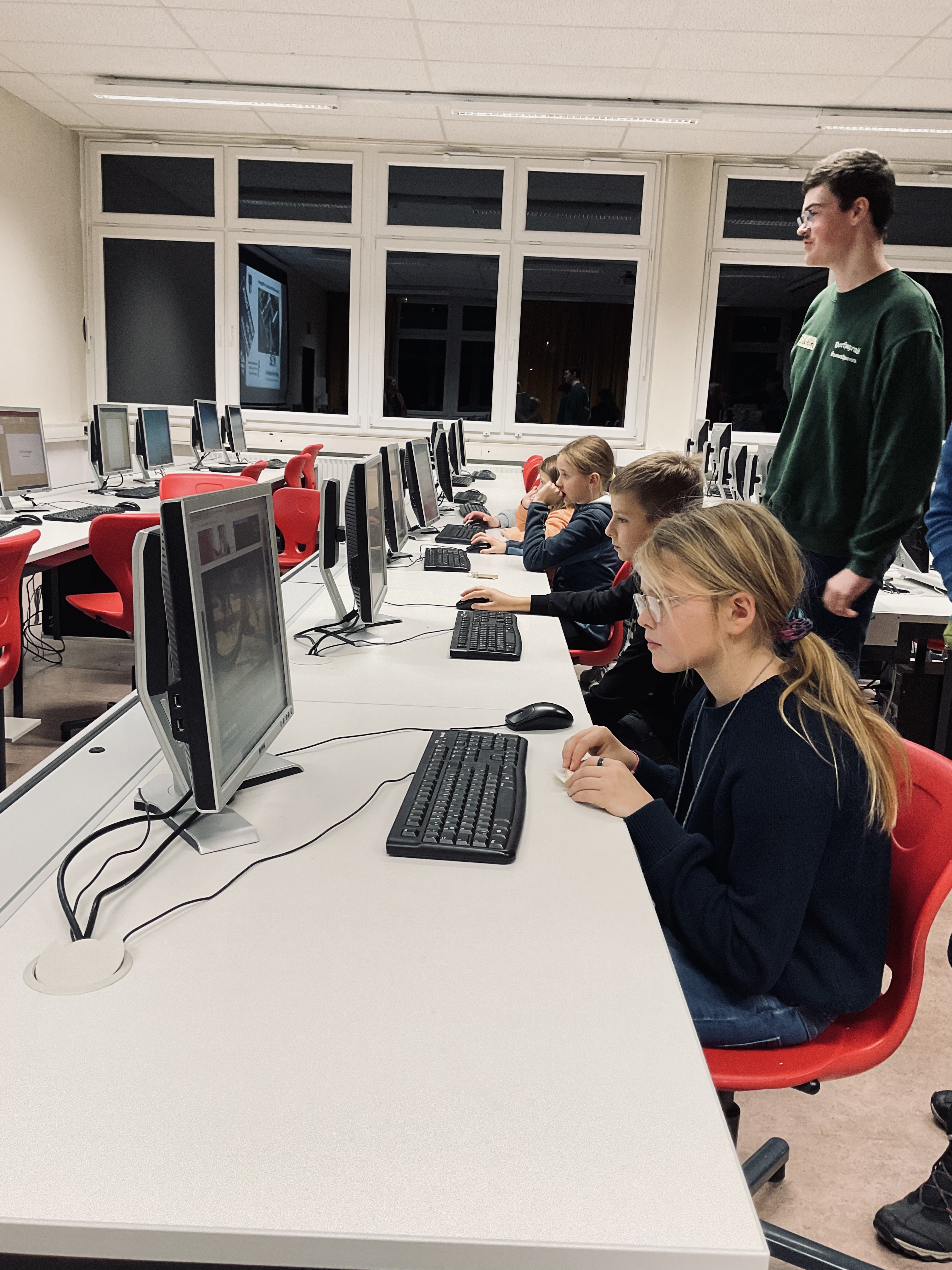 Die Grundschüler wurden im Rahmen einer Schulrallye von älteren Schüler*innen durch die Schule geführt und mussten kleine Rätsel lösen oder Aufgaben in den Fachräumen erledigen. Am Ende der Veranstaltung gab es für alle dann in der Aula einen Schokoladen – Nikolaus zur Belohnung.