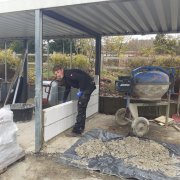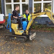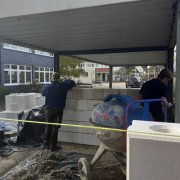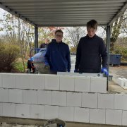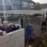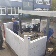 Anschließend wurde mit einem kleinen Bagger ausgeschachtet und Fundamente gegossen. Eine Woche später wurde sowohl freitags ab 10:00 Uhr als auch am Samstag gearbeitet. An diesen zwei Tagen lernten die Schüler, wie Wände gemauert werden. Immer wieder wurden die Schüler für die an den Tag gelegte Motivation gelobt.