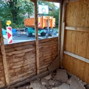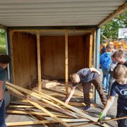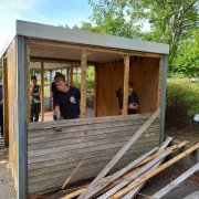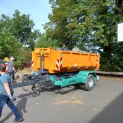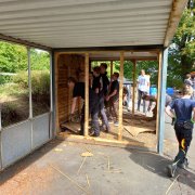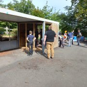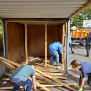 Zwei Wochen später wurde der alte Schuppen entkernt und alle Wände rausgerissen, so dass nur noch das Stahlgerüst stehen blieb. Dabei wurden wir mit einem großen Kipper vom Bauhof der Gemeinde Erndtebrück unterstützt. Die Jungs der Bau AG hatten sichtlich Spaß bei dieser Arbeit.