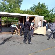 Nach den Herbstferien wurde dann mit dem Wiederaufbau des Schuppens losgelegt. An einem Freitagnachmittag wurden die Schüler der Bau AG federführend von Harald Dörnbach und Moritz Eigner von der Firma Berge Bau angeleitet. Doch bevor es losging, gab es eine Überraschung durch Sebastian Finger von der Firma Rompel Baustoffe aus Bad Berleburg. Die Firma Rompel Baustoffe spendierte den sichtlich erfreuten Schülern der Bau AG eine Starter Handwerker Set bestehend aus Latthammer, Kelle, Handschuhe, Zollstock und Bleistift. Vielen Dank dafür!