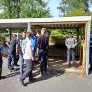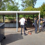 Zu Beginn des Schuljahres haben sich 14 Jungen aus den Klassen 8 dazu entschlossen, die freiwillige Arbeitsgemeinschaft Bau AG zu wählen. Dabei ist die Bau AG keine normale AG, die jede Woche zweistündig stattfindet, sondern eine Projekt AG, da auch mal an einem Freitagnachmittag oder an einem kompletten Samstag gearbeitet wird. Erfreulicherweise haben sich die heimischen Unternehmen Berge Bau, Busch Fliesen und Schaller Bedachungen dazu bereit erklärt, an dem Vorhaben mitzuwirken. Ohne die Unterstützung der drei Betriebe wäre eine solche Projekt AG nicht realisierbar. Daher an dieser Stelle ein großer Dank an die Unternehmen, die nicht nur die Mitarbeiter für dieses Projekt, sondern auch alle Materialien zur Verfügung stellen. Außerdem steht uns Schulhausmeister Timo Saßmann immer mit Rat und Tat zur Seite. Während der Planung waren sich schnell alle Beteiligten einig, dass der etwas in die Jahre gekommene Fahrradschuppen, der zudem als Winterlager für den Schulhausmeister dient, neu aufgebaut werden soll. Nach einigen Treffen stand der Plan und es konnte losgehen.