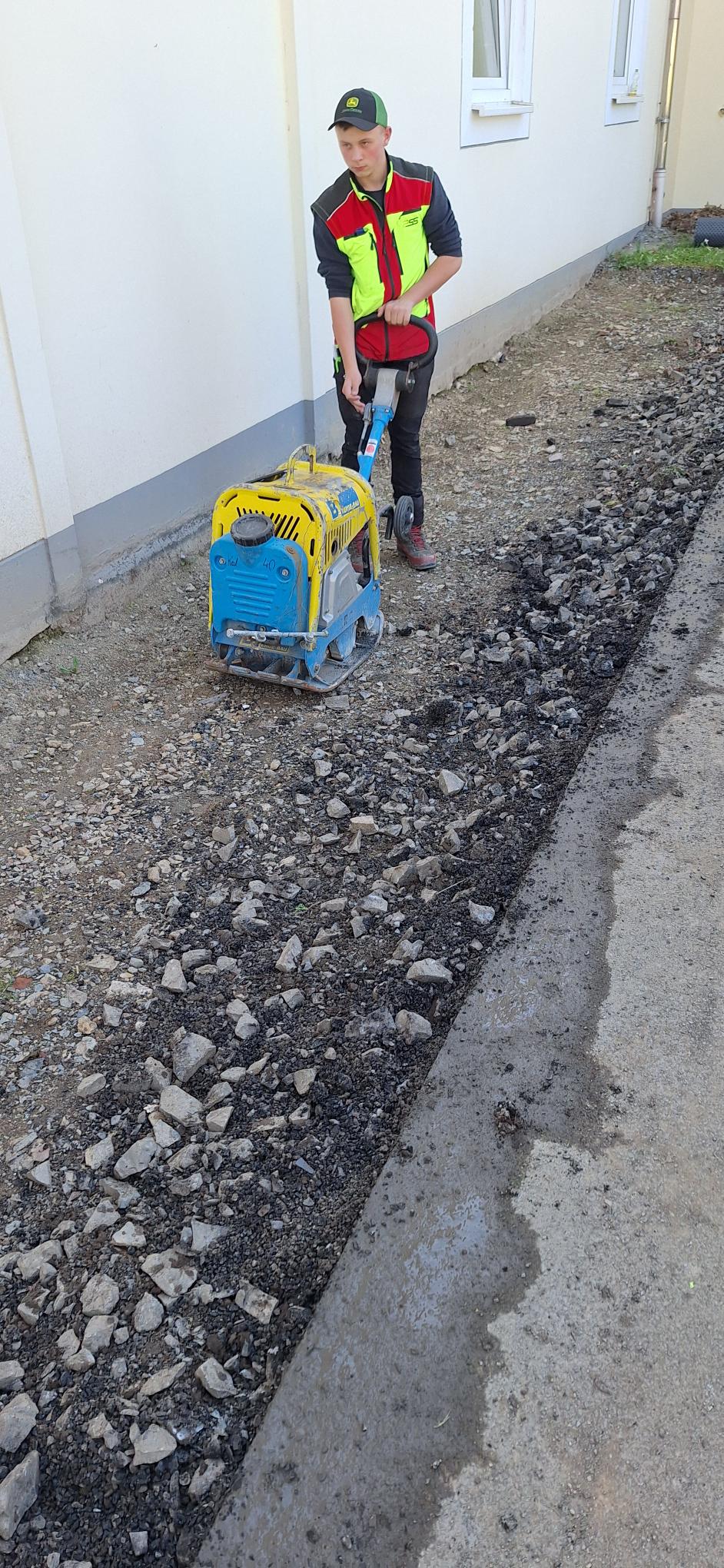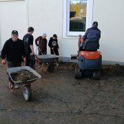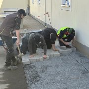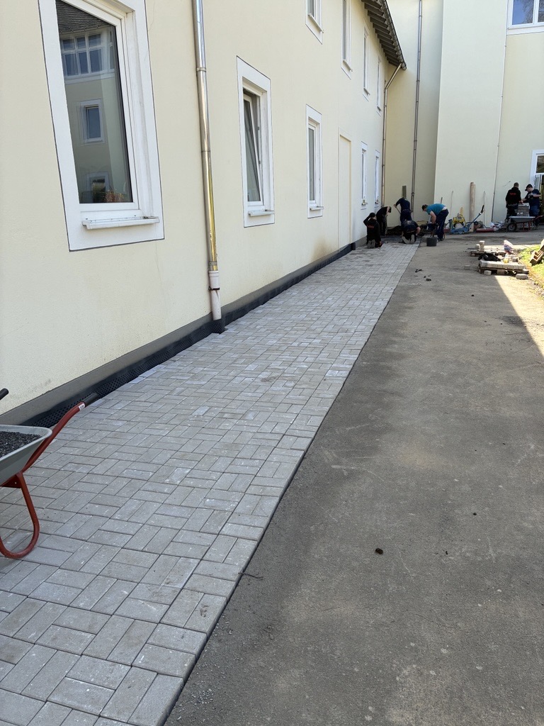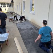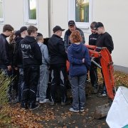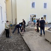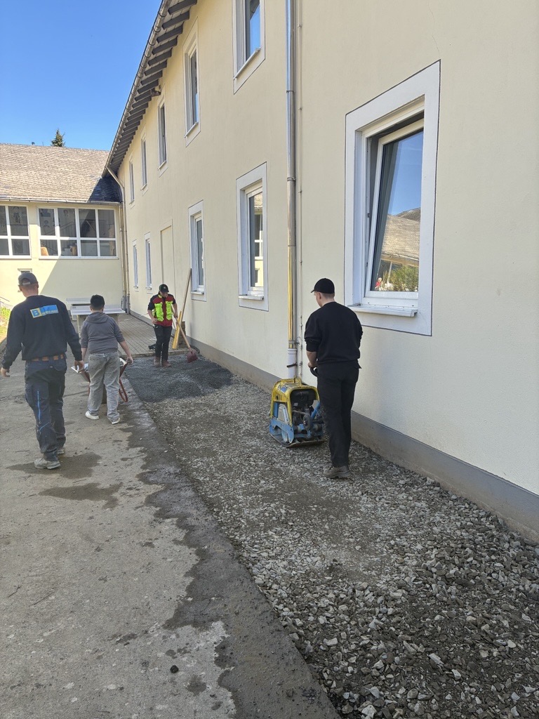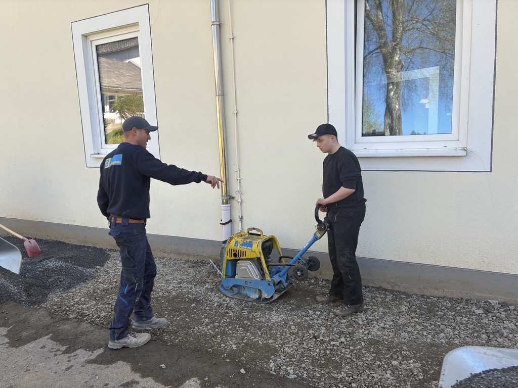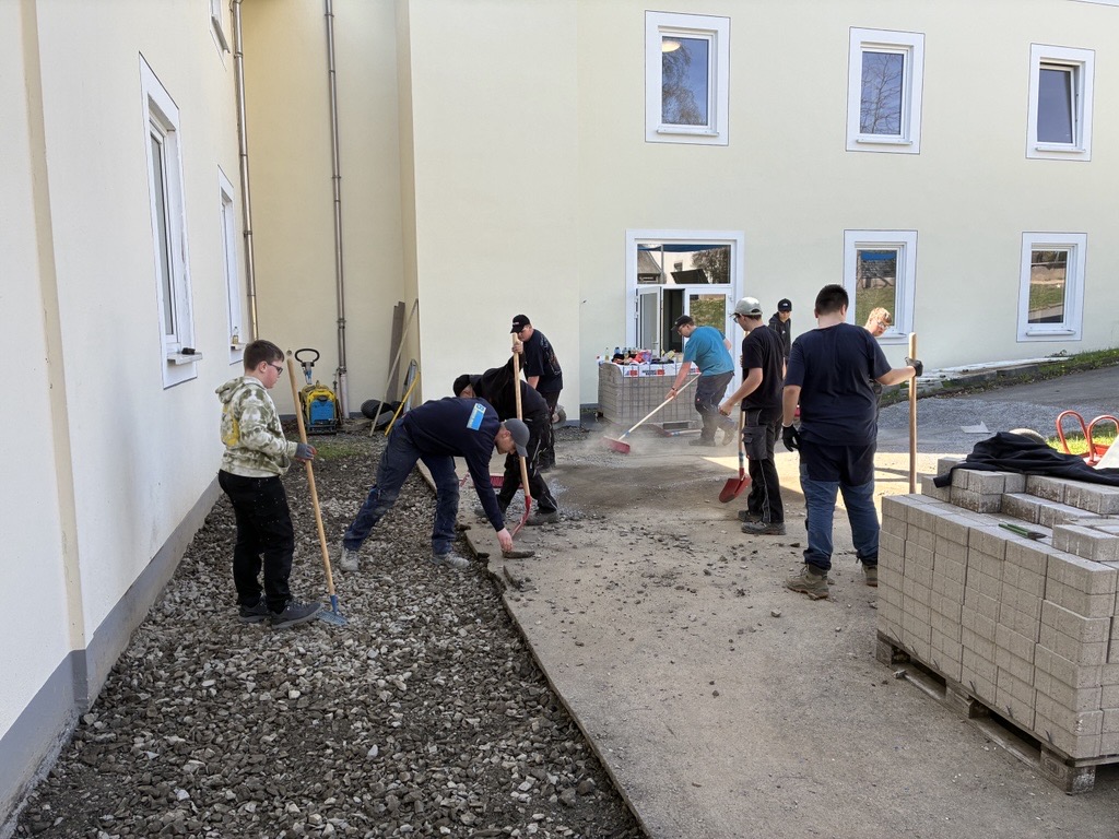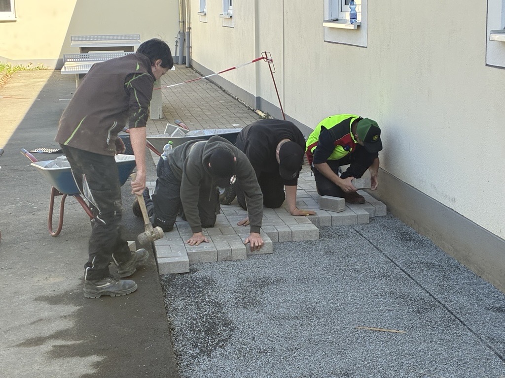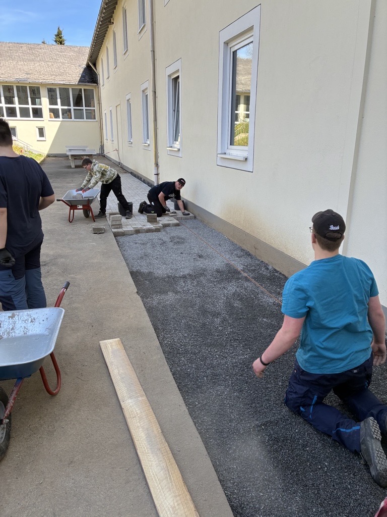 Gemeinsam mit der Firma Berge Bau wurden Pflasterarbeiten hinter den Tischtennisplatten umgesetzt. Ziel war die Erweiterung und Aufwertung der dortigen Flächen – ein Projekt, das von der Planung bis zur Ausführung in den Händen der Bau-AG lag. Unterstützt wurden die Jugendlichen dabei fachkundig von Moritz Eigner von Berge Bau sowie vom Techniklehrer und Bau AG-Leiter Jörg Hassel.